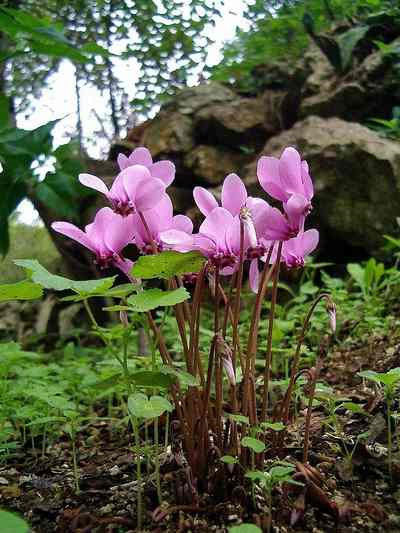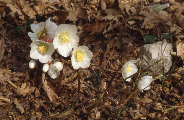 Die Gras-und Krautschicht ist reich an Blumen, z.B. Christrose, Alpenveilchen/Cyclamen, Immergrün, verschiedene Anemonen, Blutroter Storchschnabel.